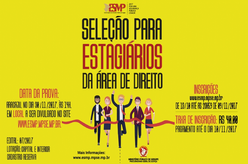 O Ministério Público de Sergipe, através da Escola Superior, torna público o Edital nº 07.2017 referente ao Processo Seletivo de estagiários de nível superior na área de Direito. As inscrições serão abertas no dia 13 de outubro e poderão ser efetuadas até às 23h59 do dia 9 de novembro, através do site www.esmp.mpse.mp.br.