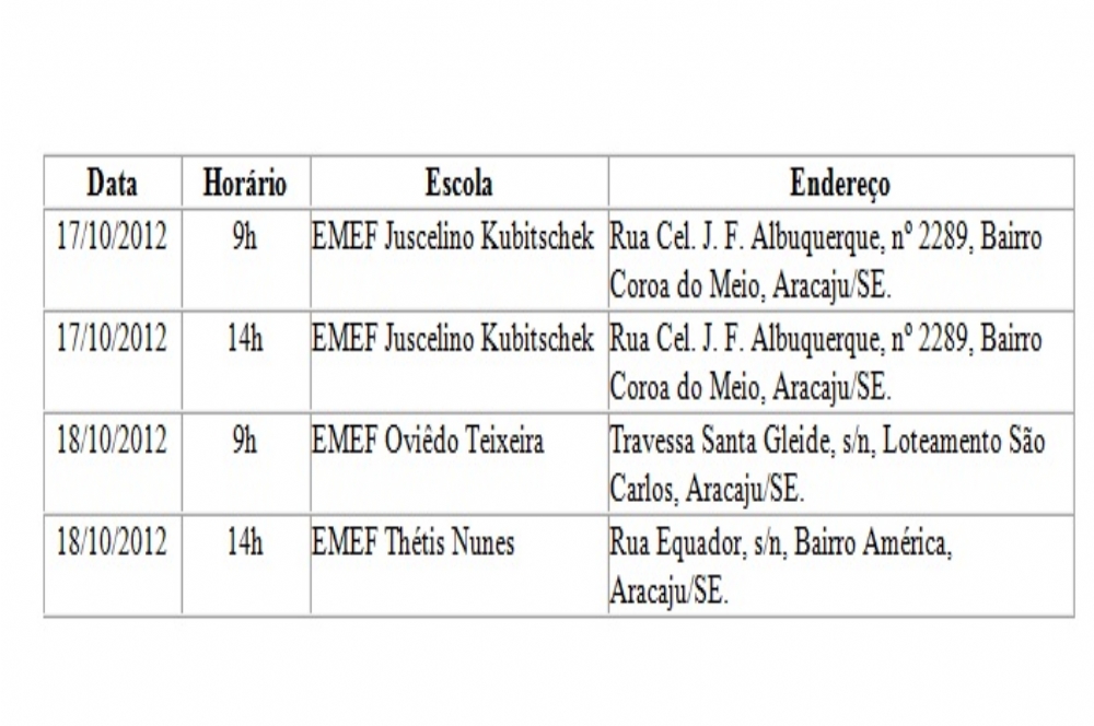 A Secretaria Municipal de Educação de Aracaju recepcionou o Projeto que, em sua primeira edição, foi apresentado na Escola Municipal José Antônio da Costa Melo, localizada no Bairro Getúlio Vargas, para alunos do 5º ao 9º ano do ensino fundamental, professores e equipe pedagógica. Agora o Projeto será levado às Escolas Municipais de Ensino Fundamental Juscelino Kubitschek, Oviêdo Teixeira e Thétis Nunes.