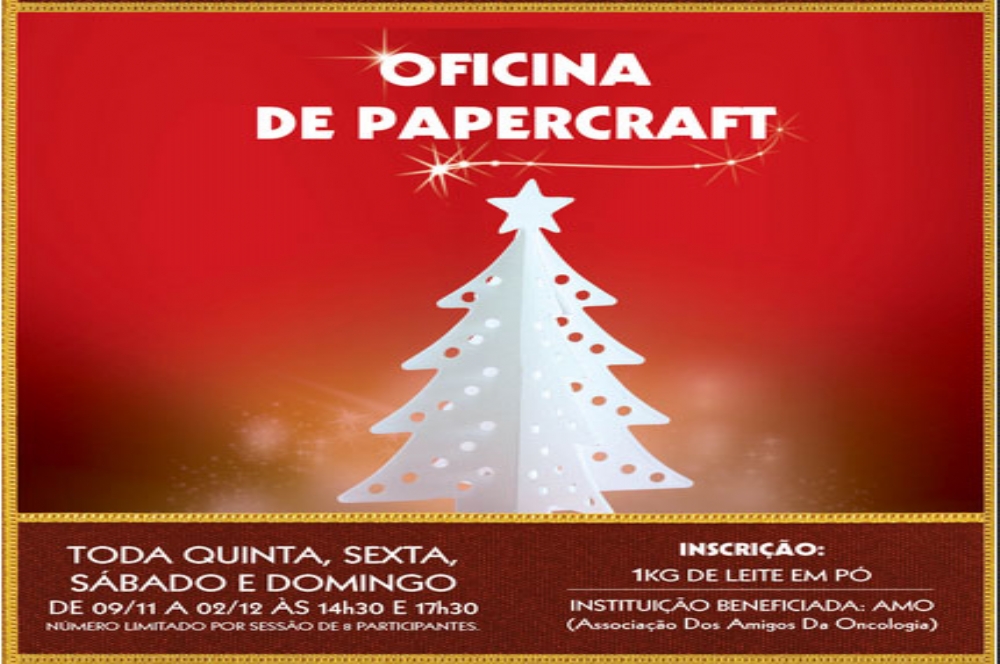 Até 2 de dezembro, o shopping Jardins oferece uma criativa oficina de Paper Craft. Habilidosos artistas prometem surpreendê-lo com a multiplicidade de formas em terceira dimensão que conseguem dar a uma matéria prima tão simples como o papel. E o melhor, além de se impressionar com as obras destes talentos, você terá a oportunidade de testar sua habilidade manual. As aulas acontecem de quinta-feira a domingo, sempre às 14h30 e 17h30, no espaço principal do Jardins. A participação está condicionada à doação de uma lata de leite em pó, que será repassada à Associação dos Amigos da Oncologia (Amo). As vagas são limitadas e serão preenchidas de acordo com a ordem de chegada dos participantes.