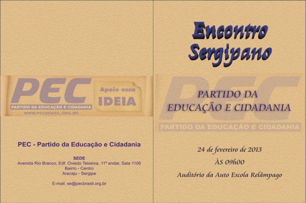 O Partido da Educação e Cidadania (PEC) realiza neste domingo, dia 24, o "Encontro Sergipano do Partido da Educação”. O evento será realizado no auditório da escola Relâmpago e segue até às 15h50 quando haverá o encerramento do encontro.