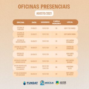 – Oficina de Gestão de Pessoas: Carga Horária: 2h | 18/08 | Horário: 10h às 12h | Local de realização: Centro da Juventude (Praça da Juventude, s/n, Conjunto Augusto Franco, bairro Farolândia);