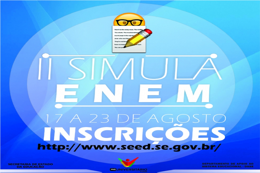 Com aplicação simultânea em todas as regiões sergipanas, o governo de Sergipe, por meio da Secretaria de Estado da Educação, realizará nos dias 16 e 17 de setembro, a segunda edição do Simula Enem. As inscrições para esta avaliação simulada das provas do Exame Nacional do Ensino Médio (Enem) estão abertas até o dia 23 de agosto, e o candidato interessado em participar deverá se inscrever, de forma gratuita e online, no Portal da Seed.