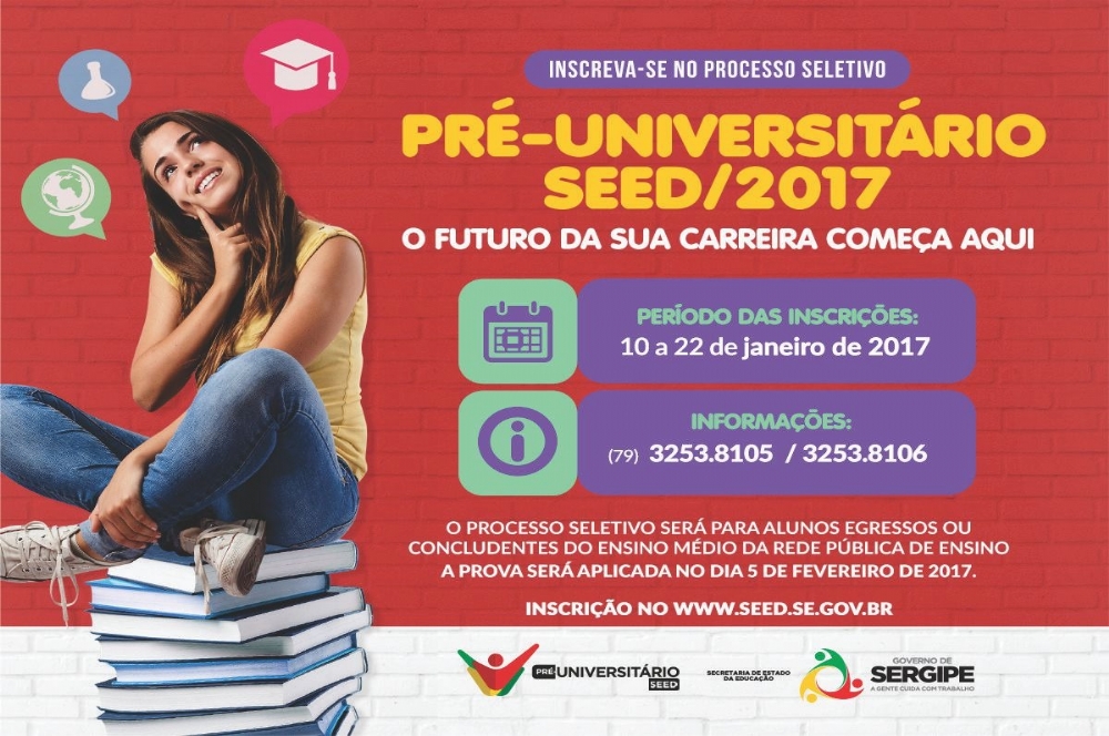 O Governo de Sergipe, por meio da Secretaria de Estado da Educação (Seed), oferta, até o dia 22 de janeiro, inscrições para o Preuni, o maior curso preparatório para as provas do Exame Nacional do Ensino Médio (Enem). Os candidatos poderão se inscrever no site da Seed e posteriormente, serão submetidos a uma avaliação que acontecerá no dia 05 de fevereiro pelo fato de a demanda ser maior que a oferta de vagas.