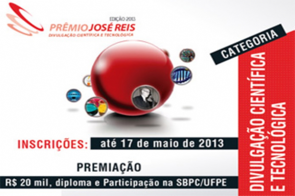 Pesquisadores, escritores, jornalistas e instituições de comunicação podem inscrever trabalhos que divulgam a Ciência e Tecnologia para concorrer ao tradicional Prêmio José Reis, que chega a sua 33° edição em 2013. O prêmio, criado em 1978, homenageia personalidades que contribuem para propagar e ampliar o acesso do grande público ao conhecimento ligado à Ciência, Tecnologia, Pesquisa e Inovação. Para este ano, a categoria focalizada será Divulgação Científica e Tecnológica.