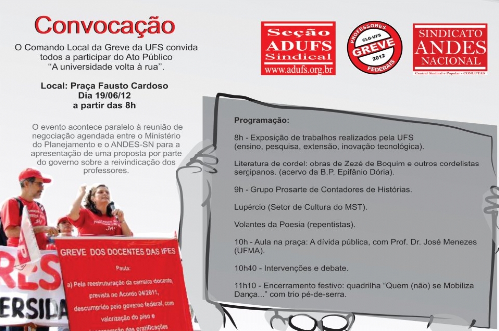 Para tanto, os professores da UFS mobilizados na Greve Nacional das Instituições Federais farão um ato amanhã, 19, a partir das 8h, na praça Fausto Cardoso. "Universidades nas ruas" é o nome da atividade de amanhã que contará com a presença de repentistas, movimentos sociais, aula-pública e sindicatos do funcionalismo público. Paralelo a atividade, os Professores da UFS farão uma vigília em solidariedade aos professores que entrarão na mesa de negociação com o governo, em Brasília.