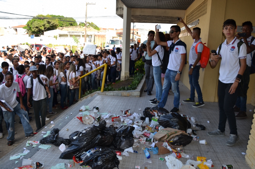 “A exemplo de todas as demais escolas da rede estadual, o Colégio D. Luciano está passando por uma grande problemática por falta de estrutura: toda a distribuição da merenda e a limpeza do prédio estão comprometidas. Estamos em ambiente insalubre, sem condições de desenvolver um trabalho pedagógico”, ressaltou o professor Ailton Feitosa. “Recolhemos o lixo do pátio e vamos entregar como presente ao secretário”, destacou o professor Émerson Calistro.