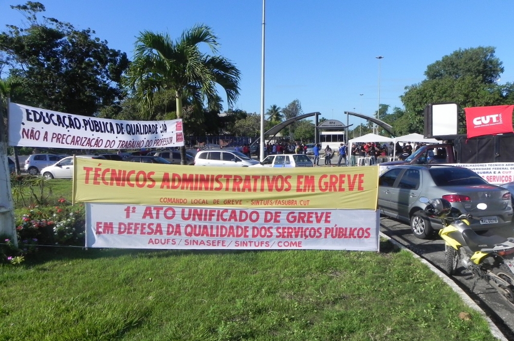 Com o objetivo de sensibilizar a população os Comandos de Greve dos professores, técnicos administrativos e estudantes realizam o primeiro Ato Unificado. A manifestação acontece durante a manhã desta quarta-feira, 4, na entrada principal da Universidade Federal de Sergipe (UFS). As categorias bloquearam a entrada principal da cidade universitária com carros, barreira humana e cones.