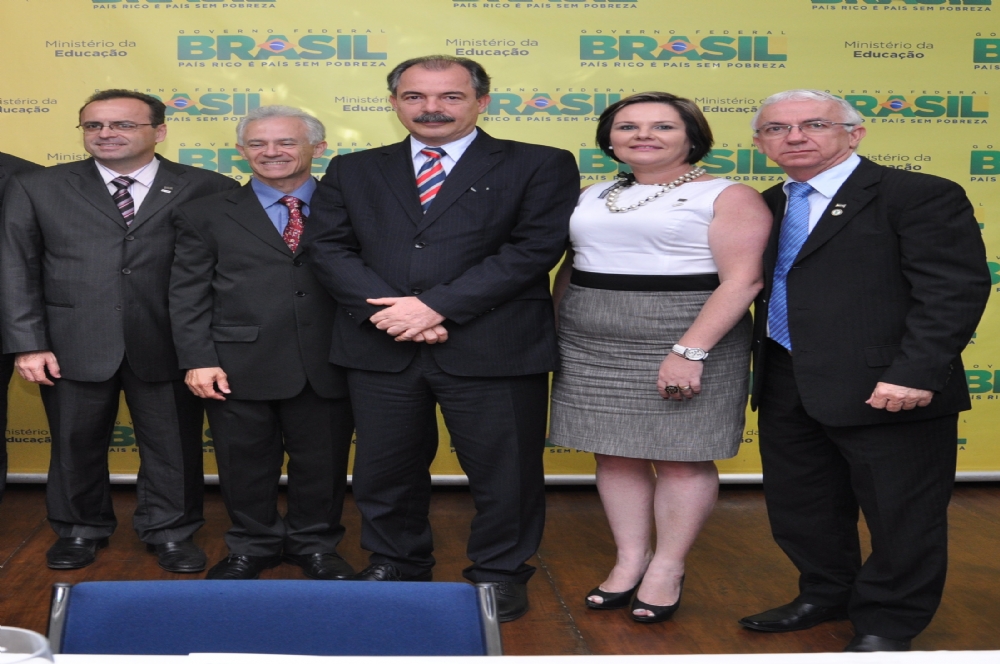 Compuseram a mesa durante a solenidade Aloizio Mercadante, ministro da Educação, Dênio Arantes, novo presidente do Conif, Henrique Paim, secretário executivo do MEC, Cláudio Ricardo de Lima, que deixa a presidência da entidade, e Eliezer Pacheco, secretário de educação profissional.