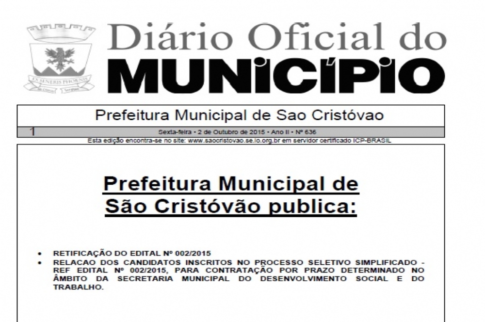 No último dia 02 de outubro, foi publicada no Diário Oficial do Município a retificação do Edital de Processo Seletivo Simplificado n° 02/2015 da Prefeitura de São Cristóvão, que fixava inicialmente a carga de 40h de trabalho semanais, descumprindo assim a Lei Federal 12.317.