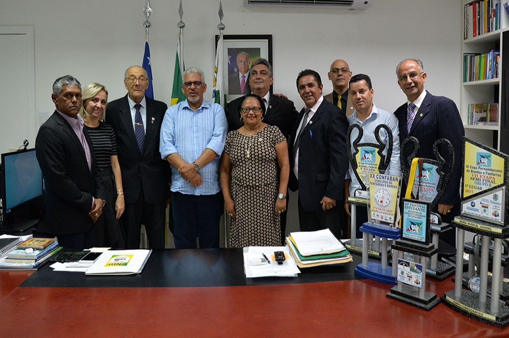 Participaram da audiência com o secretário Jorge Carvalho, o presidente da Confederação Nacional de Bandas e Fanfarras e diretor da Secband/Seed, maestro Rivaldo Dantas; o tesoureiro da CNBF, Washington de Oliveira Souza; o chefe de Cerimonial do Governo de Pernambuco, Jandir Jorge de Souto; o presidente da Associação Nacional do Norte/Nordeste de Bandas e Fanfarras, Júlio Ruffo; o coordenador de Ações Culturais de Pernambuco, Waldenilson Costa; a secretária Maria Judithe; Almir Garcez, chefe do Cerimonial da Seed e Eliane Passos, diretora da DEA.