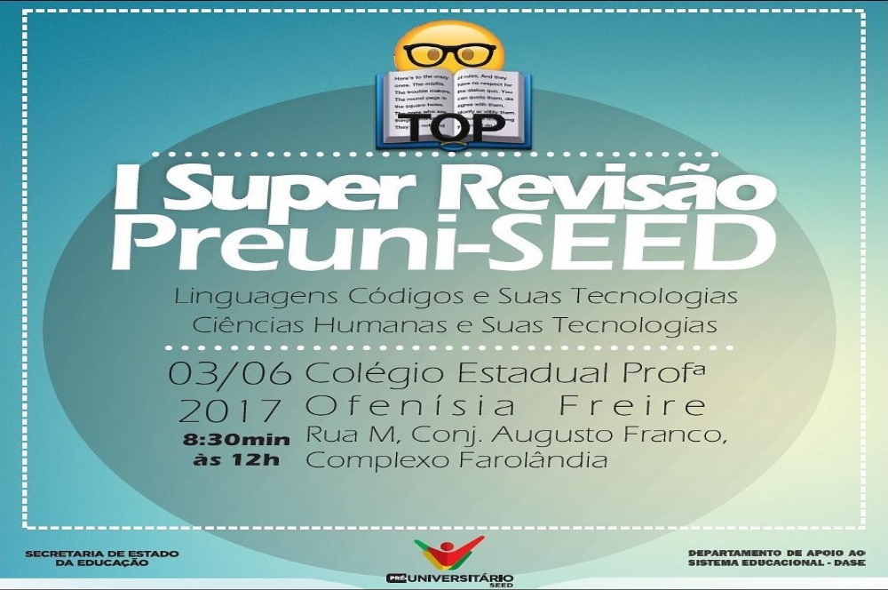 Alunos da rede estadual de ensino terão a oportunidade de participar neste sábado, 2, da I Super Revisão do Curso Pré-Universitário da Secretaria de Estado da Educação. Promovido pelo Departamento de Apoio ao Sistema Educacional (Dase/Seed), a revisão contará com dois aulões, sendo um na capital e outro em Neópolis.