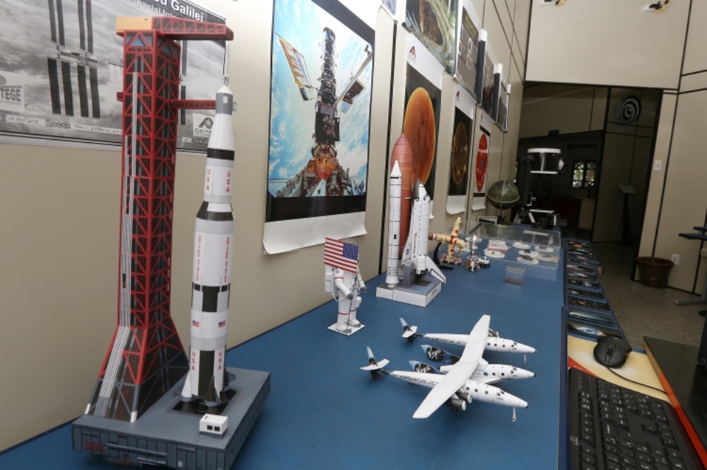 Olha, além do cheiro lunar e do Sputinik I, a CCTECA tem outras réplicas de foguetes, como o Saturno V, que levou o homem à Lua, e o Atlantis, que esteve lá em seguida e encerrou as atividades em 1972. Tem também informações sobre foguetes atuais, como o SLS, que está na fase de testes. "Enquanto isso, os Estados Unidos e mais 15 países estão com essa base no espaço que é a Estação Espacial Internacional. Ela fica em volta da Terra, uns 400 km, dá uma volta a cada 1h em meia e tem seis astronautas morando periodicamente", informou diretor da CCTECA.