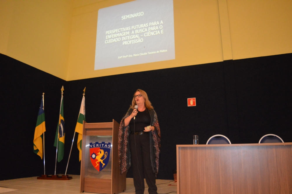 | A presidente do COREN-SE Maria Cláudia Tavares de Mattos, em palestra durante o evento |