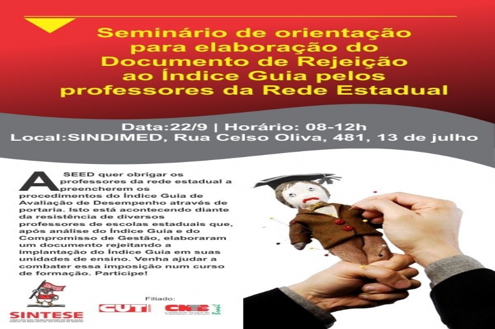 Para ajudar a combater essa imposição nas escolas da rede estadual, o Sintese convida professores e professoras da rede estadual para o Seminário de orientação para elaboração do Documento de Rejeição ao Índice Guia, que acontecerá neste sábado, 22, das 08 às 12h, no auditório do Sindimed.