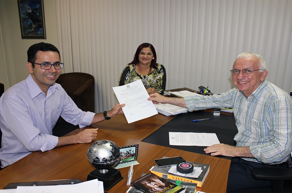 | Reitor Ailton Ribeiro de Oliveira (à direita) e Prof. Lício Valério seguram portaria do mestrado. Pró-reitora de Pesquisa e Extensão, Ruth Sales, ao fundo (Foto: IFS) |