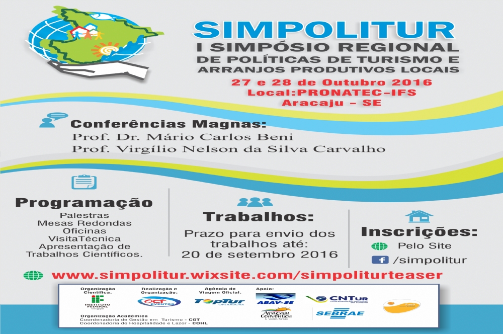 A comissão organizadora do I Simpósio Regional de Políticas de Turismo e Arranjos Produtivos Locais – Simpolitur, do Instituto federal de Sergipe – campus Aracaju, a ser realizado de 27 a 28 de outubro de 2016, receberá inscrições para artigos científicos até o dia 20 de setembro. O evento se constitui numa realização das Coordenadorias dos cursos de Gestão em Turismo e Hospitalidade e Lazer, com parceria do Escritório Modelo de Turismo e dos grupos de pesquisa “Observatório Político de Turismo” e “Gestão de Arranjos Produtivos Locais”.