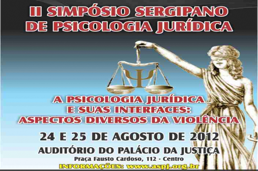 A ASPJ – Associação Sergipana de Psicologia Jurídica promoverá o II Simpósio Sergipano de Psicologia Jurídica, sob o tema “A Psicologia Jurídica e suas interfaces: aspectos diversos da violência”, o qual está sendo realizado com parceria do Tribunal de Justiça de Sergipe – TJSE, por meio da Escola de Administração Judiciária – ESAJ e da Coordenadoria da Infância e da Juventude – CIJ, do Conselho Regional de Psicologia – CRP 19ª e também com apoio da OAB/SE.