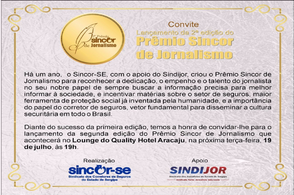 Depois do sucesso da primeira edição, o Sindicato dos Corretores de Seguro em Sergipe (Sincor-SE) lança no dia 19, o Prêmio Sincor-SE de Jornalismo 2016.