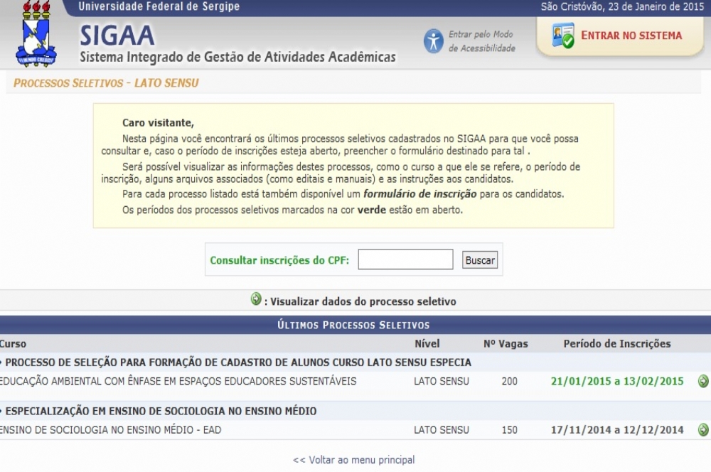 As inscrições tiveram início na quarta-feira, 21, e se estende até o dia 13 de fevereiro, devendo serem feitas no Núcleo de Pós-Graduação EAD/CESAD, no campus de São Cristóvão da Universidade Federal de Sergipe (UFS), nos horários de 8h às 12h e de 14h às 17h, de segunda a sexta-feira. A inscrição do candidato via web deve ser feita no seguinte endereço eletrônico:
