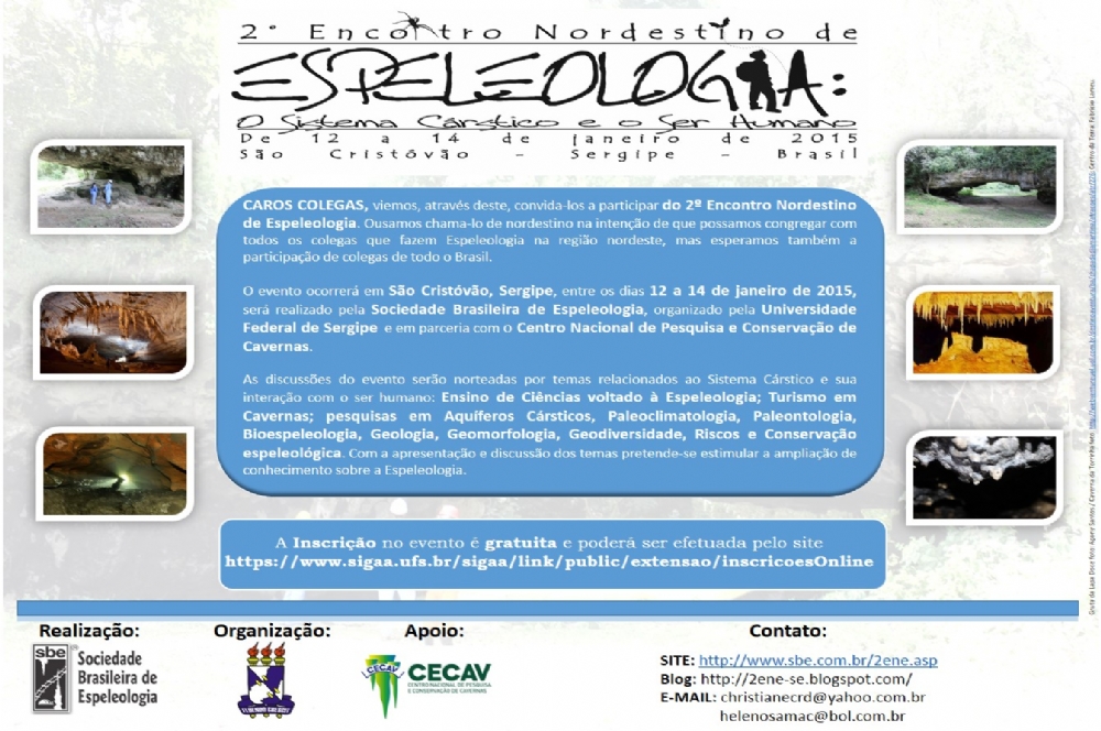 O 2º Encontro Nordestino de Espeleologia acontece entre os dias 12 e 14 de janeiro, na Universidade Federal de Sergipe. O público do evento é formado por espeleólogos autônomos, grupos de espeleologia e alunos de cursos de graduação e pós-graduação (Geografia, Geologia, Biologia, Ecologia, Turismo, Engenharias Florestal e Ambiental, Direito, cursos de licenciatura, entre outros).