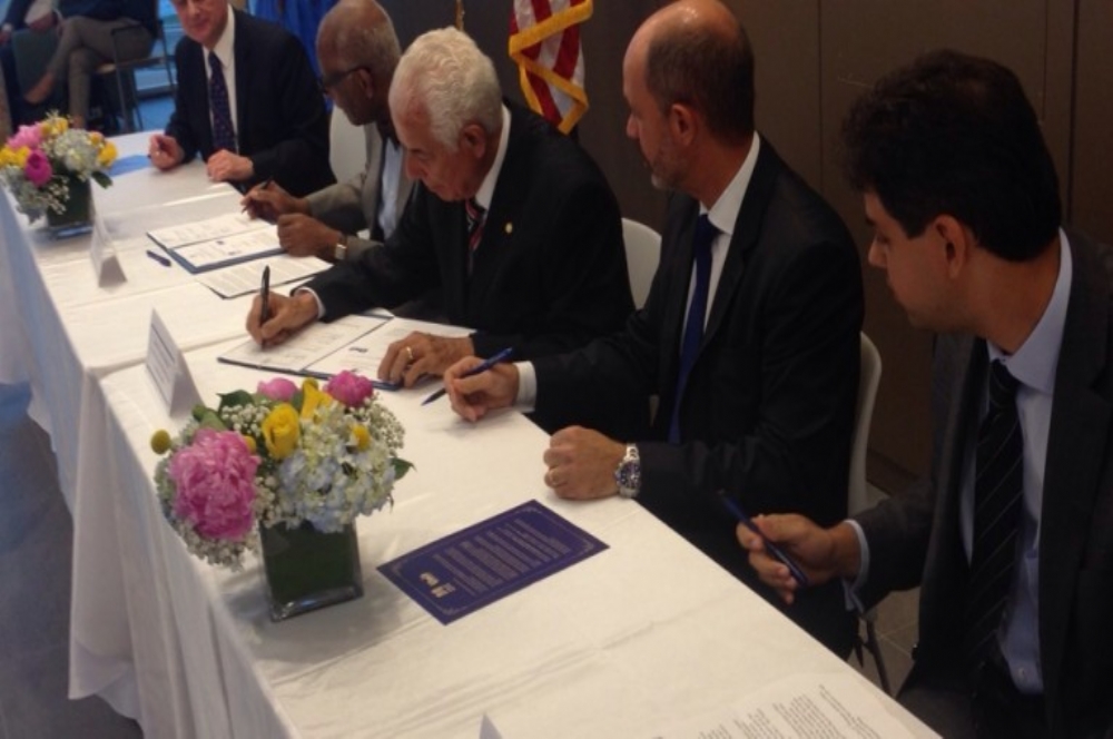 | Momento em que Ucho assina a parceria em Boston (Foto: Ascom/Unit) |