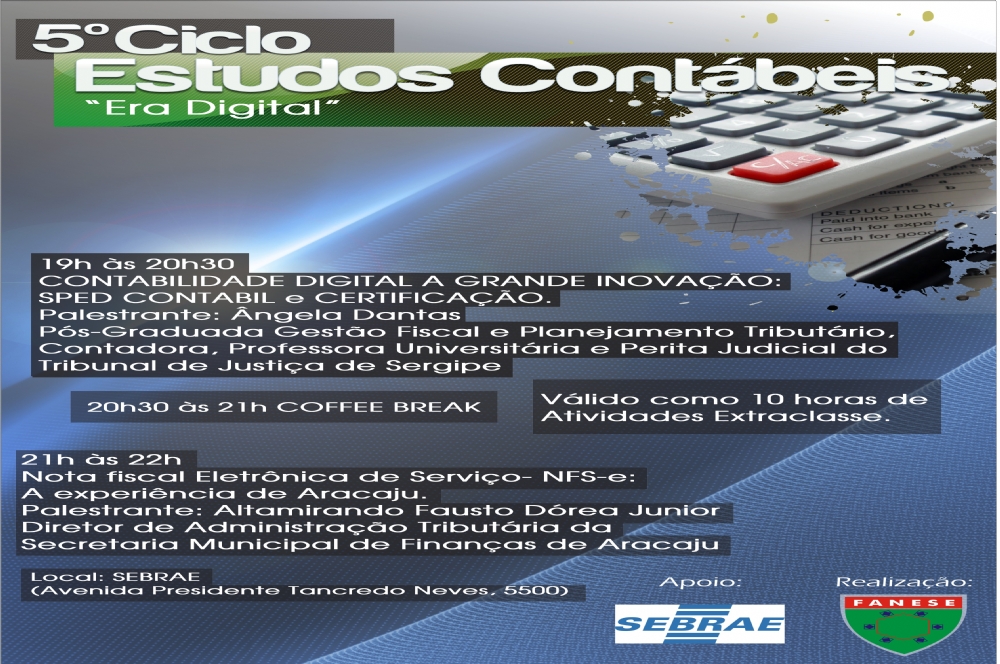 No próximo dia 25 a coordenação do Curso de Ciências Contábeis da FANESE estará realizando o evento V Ciclo de Estudos Contábeis Era Digital. A coordenação é da professora Luciana Matos. O evento acontecerá no Auditório do SEBRAE (Avenida Presidente Tancredo Neves, 5500 Aracaju). As Inscrições estão abertas para a comunidade interna e externa e podem ser realizadas na Secretaria da faculdade do Campus Edgard Freitas, no Santo Antônio. A participação é valida como 10 horas de Atividades Extraclasse.