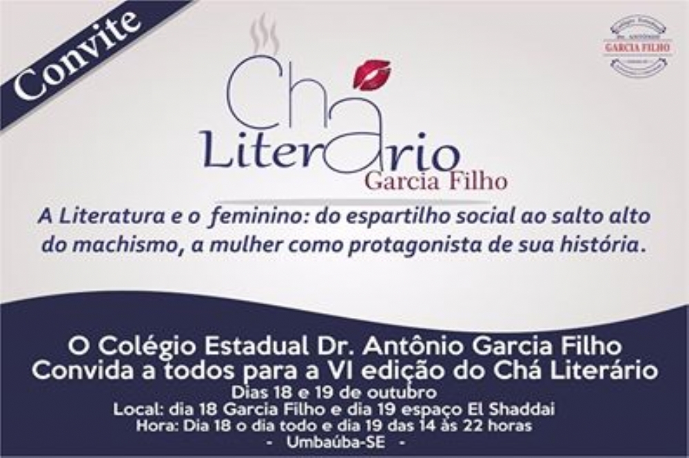 Nos dias 18 e 19 deste mês de outubro acontecerá no Colégio Estadual Dr. Antônio Garcia Filho, em Umbaúba, a VI edição do Chá Literário. Neste ano, o tema do evento é “Literatura e o feminino: do espartilho social ao salto alto do machismo, a mulher como protagonista de sua história”.