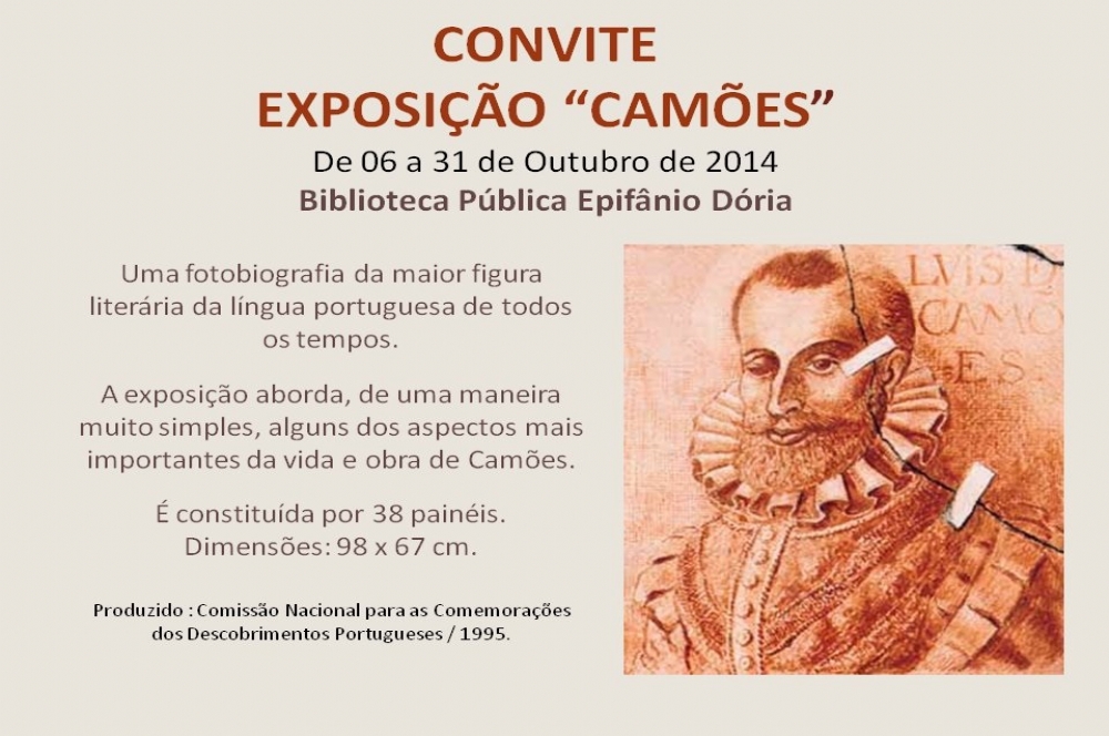 Para celebrar o Dia Nacional do Poeta, a Biblioteca Pública Epifânio Dória, realizará entre os dias 6 e 31 de outubro, a exposição “Camões”. Serão 38 paineis, que abordarão de uma maneira muito simples e através de uma fotobiografia, os aspectos mais importantes da vida e obras de Camões.