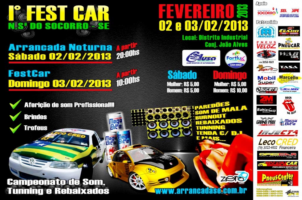 O 1º Fest Car de Nossa Senhora do Socorro será realizado neste final de semana, 2 e 3, no Distrito Industrial do Conjunto João Alves. Os pilotos que quiserem participar do Fest Car têm até a sexta-feira, 1º, para efetuar a inscrição na loja Pneu Car ou no local do evento, até duas horas antes do início. O valor para cada piloto é R$ 100.