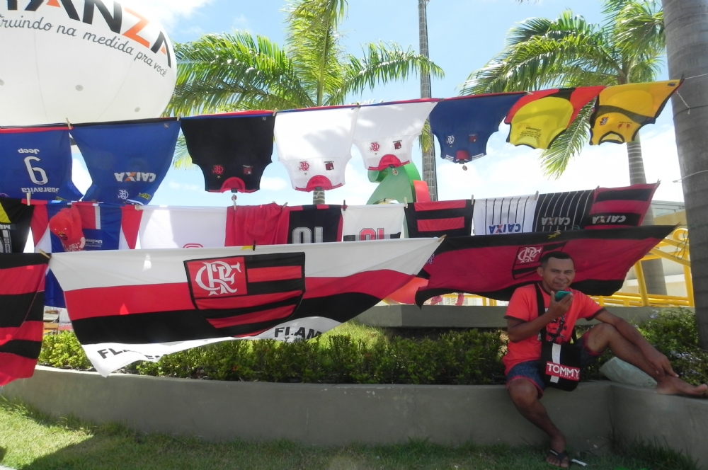 Os momentos que antecedem a grande disputa que reunirá centenas de torcedores do Flamengo e do Confiança na Arena Batistão estão sendo cruciais para vendedores ambulantes. Ao compor um verdadeiro cenário de camisas ao vento, penduradas em varais, eles aguardam um bom faturamento.