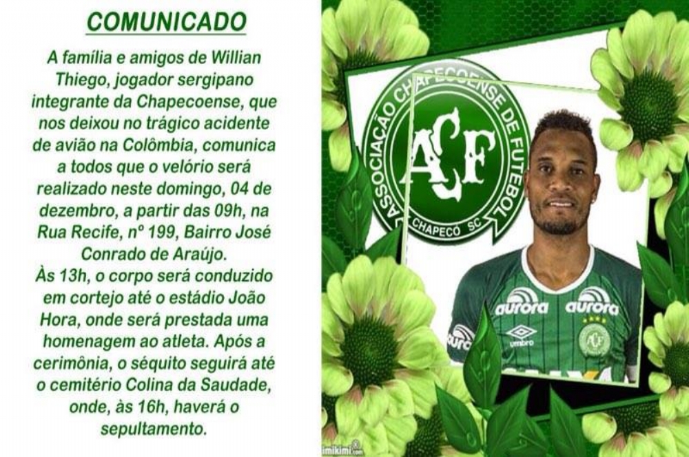 “A família e amigos de Willian Thiego, jogador sergipano integrante da Chapecoense, que nos deixou no trágico acidente de avião na Colômbia, comunica a todos que o velório será realizado neste domingo, 04 de dezembro, a partir das 09h, na Rua Recife, nº 199, Bairro Conrado de Araújo. Às 13h, o corpo será conduzido em cortejo até o estádio João Hora, onde será prestada uma homenagem ao atleta. Após a cerimônia, o séquito seguirá até o cemitério Colina da Saudade, onde, às 16h, haverá o sepultamento”, explica a nota divulgada na íntegra.