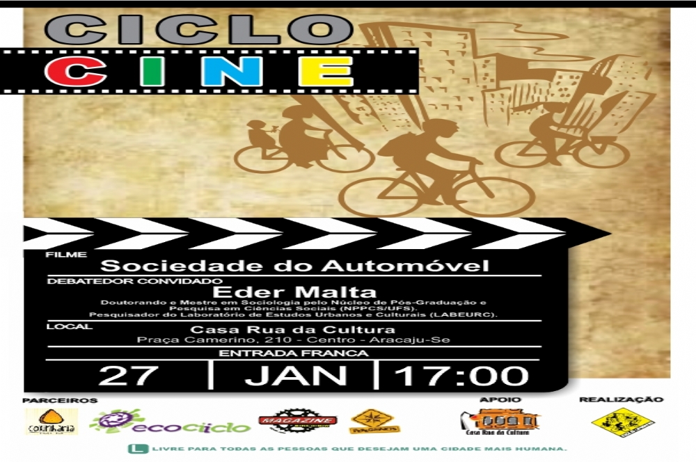 A primeira edição vai acontecer no próximo dia 27, às 17 horas, na Casa Rua da Cultura. O filme exibido será Sociedade do Automóvel, produzido por Branca Nunes e Thiago Benicchio, e o debatedor convidado será Eder Malta, mestre e doutorando em Sociologia pela Universidade Federal de Sergipe (UFS) e pesquisador do Laboratório de Estudos Urbanos e Culturais (Labeurc-UFS).