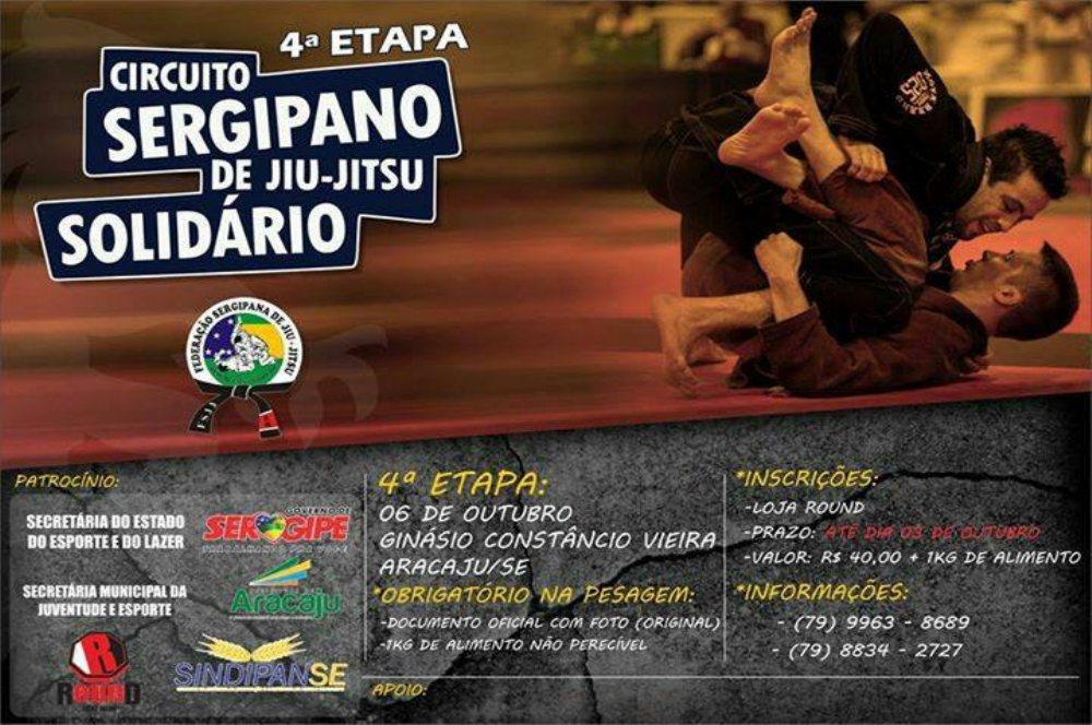 O intenso calendário sergipano de Jiu-Jitsu já traz outro compromisso para os competidores: a quarta etapa do Circuito Sergipano de Jiu-Jitsu Solidário, a ser realizado a partir da manhã do próximo domingo, 6, no Ginásio Constâncio Vieira. Com participação confirmada de atletas da Bahia, de Alagoas e do interior do estado, a competição deverá reunir mais de 300 atletas em categorias que vão de mirim a sênior.