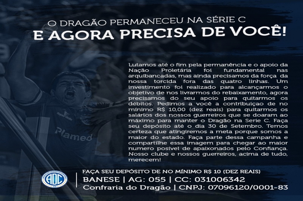 Na última semana, a Associação Desportiva Confiança lançou uma campanha que convoca torcedores a contribuir financeiramente com o time. O objetivo da ação é arrecadar R$ 120 mil para pagamento de dívidas relativas a investimentos para a Série C. De acordo com informações do clube, até o momento a campanha arrecadou R$ 8 mil. Para atingir a meta, o clube reforça a convocação junto aos azulinos.