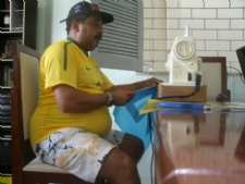 material, mas também vou para a máquina costurar as bandeiras maiores para a colocação nos postes de cada casa e bandeirolas em toda a extensão da rua”, ressalta Aurélio lembrando que na última Copa do Mundo, a rua 6 foi contemplada com o prêmio “Minha Rua é Show de Bola”. Aurélio no momento da confecção das bandeirolas