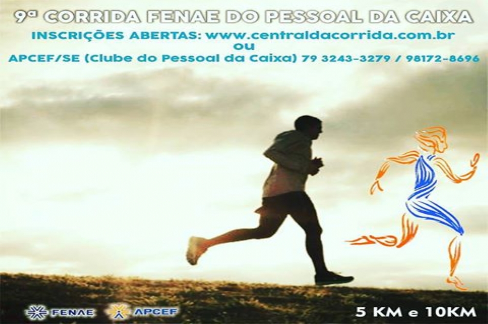 Até sábado dia 13 de maio, seguem abertas as inscrição da 9ª edição da Corrida FENAE do Pessoal da Caixa 2017, realizada pela Associação de Pessoal da Caixa Econômica Federal de Sergipe (APCEF/SE) com o apoio da Federação Nacional das Associações do Pessoal da Caixa Econômica Federal (FENAE).