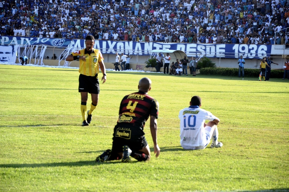 Aos 31, mais uma polêmica. Angelo cruza na área, Da Silva mergulha e empurra pro gol, o bandeira marca, claramente atrasado, um suposto toque de mão. Cartão amarelo para o Pimentinha, que saiu indignado e desfalca o Dragão na partida decisiva em Fortaleza.