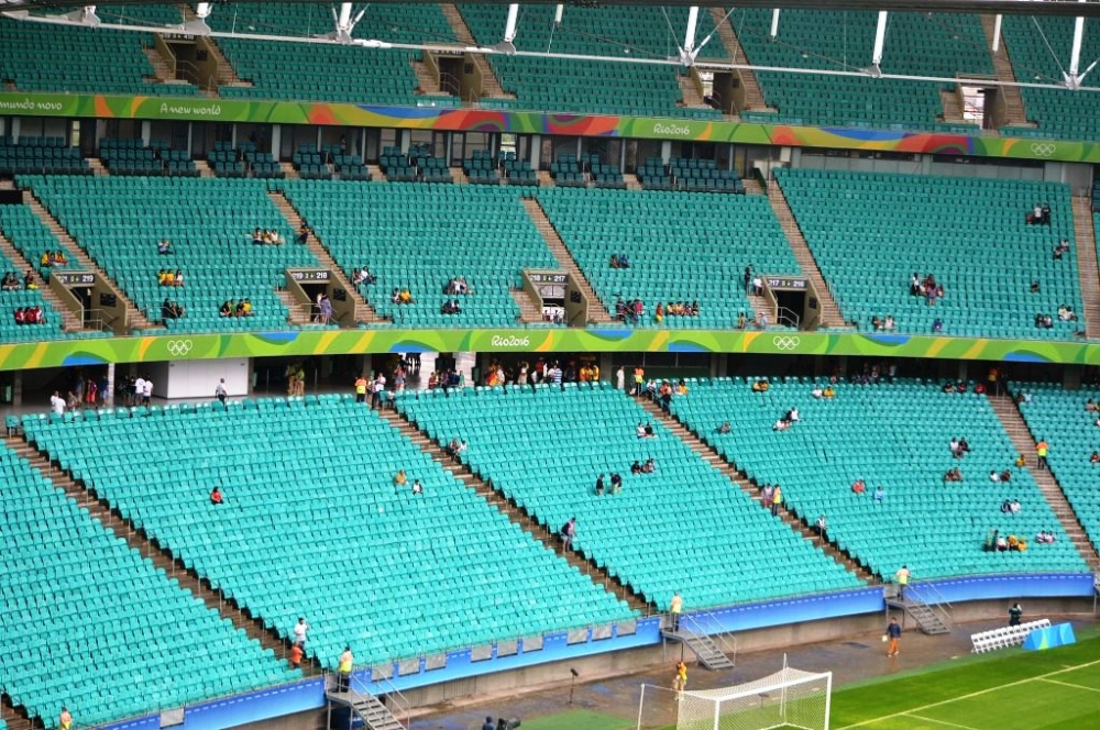 Dois anos depois de uma Copa do Mundo, não dá pra dizer que as Olimpíadas são um sucesso de público em Salvador. A poucos minutos do confronto entre México e Alemanha, o primeiro dos dez que a cidade receberá pelo futebol olímpico, o clima no entorno do estádio, nas bilheterias e até no interior era de Campeonato Sergipano. Não é possível dizer que a torcida brasileira que engrossaria o público preferiu assistir o jogo do Brasil ou fugir da garoa que caiu em Salvador. Ingressos vendidos por antecipação são à prova deste tipo de coisa.