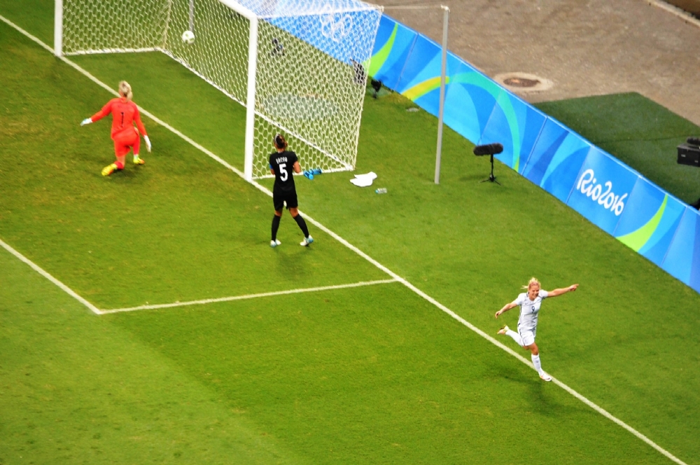 Já aqui houve menos gracinhas. As duas equipes pareciam ter muito medo uma da outra. A França de Amandine Henry não era efetiva no ataque. Já a Nova Zelândia conseguiu ir mais à frente, mas sem sucesso. Mas aos poucos a torcida foi adotando a França como xodó – mais precisamente Sakina Karchaoui, que com seus mimosos 1,60 metro fez o que quis na lateral esquerda. E aos 37, veio o prêmio para a torcida. Elise Bussaglia chutou de longe, a bola bateu na trave, e na volta, Le Sommer chutou no meio do gol com decisão e marcou: 1 a 0.