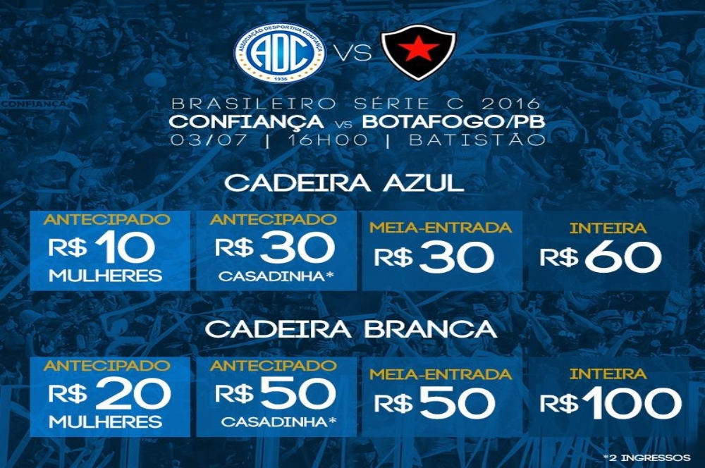 Após conquistar sua primeira vitória na série C do Campeonato Brasileiro, o Confiança espera engajar uma sequência positiva na competição e sair de vez da zona da degola do seu grupo. O desafio da vez é o Botafogo-PB, no próximo domingo, 3, às 16h na Arena Batistão. Para motivar a torcida ir ao estádio, o clube iniciou a venda dos ingressos nessa terça-feira, 28, com duas promoções para compra antecipada. As mulheres terão valores exclusivos. Os bilhetes já podem ser adquiridos na Loja do Dragão – Rua Arauá, 383 – e no Ponto do sócio-torcedor no estádio Sabino Ribeiro.
