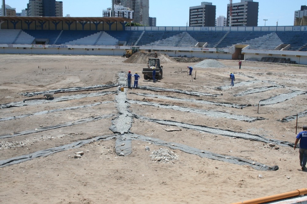 Dentro do estádio a nova drenagem do campo de futebol começou a ser instalada. Ao todo serão 3.482 metros de tubulação do tipo PAD, material específico para este fim e utilizado nas modernas arenas esportivas. Em seguida será colocada uma camada de brita que será coberta por um composto Topsoil(areia especial com 30 cm de espessura, sendo que nos últimos 10 cm ela recebe uma adução química com calcário dolomítico, superfosfato e tufas).