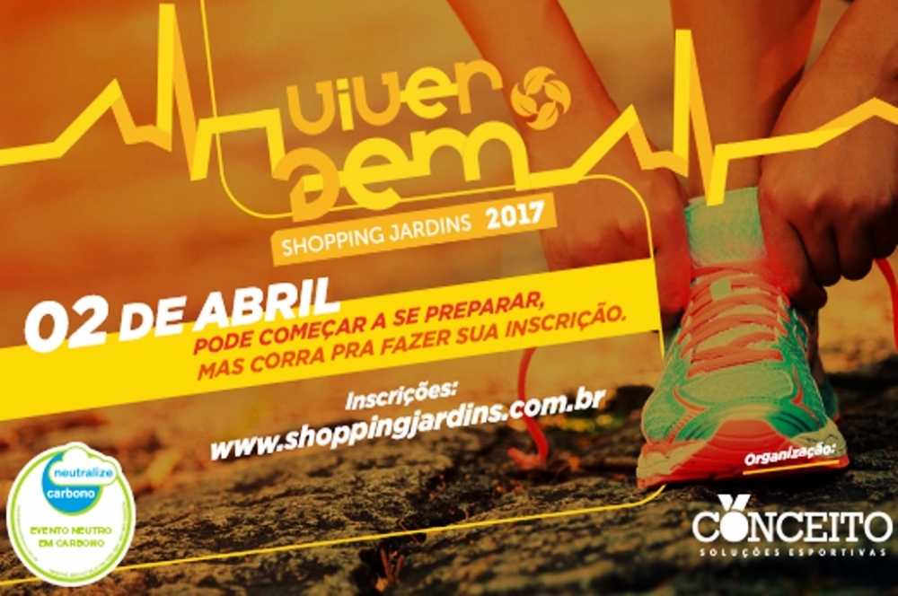 As inscrições para a corrida de rua Viver Bem, que será realizada às 7h do dia 2 de abril, se encerrarão neste domingo, 26. De acordo com o regulamento da competição, a participação na prova custa R$ 90 mais um quilo de alimento não perecível. Participantes de clube de corrida pagam R$ 80 mais um quilo de alimento, e portadores de necessidades especiais só precisam contribuir com o quilo de alimento. As inscrições também podem ser feitas no site www.shoppingjardins.com.br.