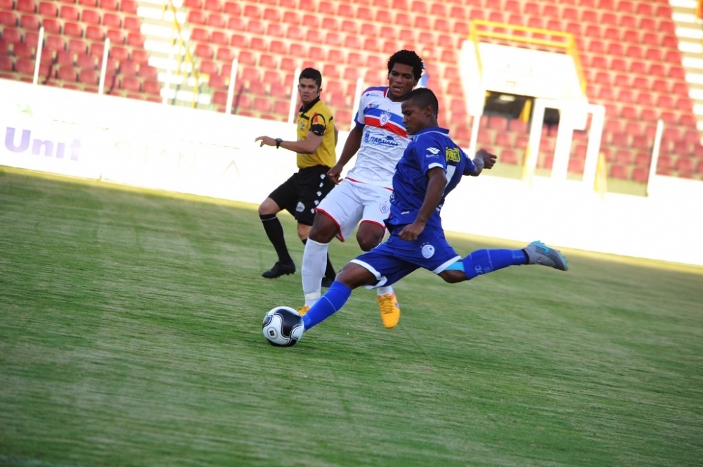 Público fraco, futebol ainda pior. Os primeiros minutos do clássico foram sofríveis. Ninguém parecia muito animado a atacar, e os goleiros apenas assistiam. O primeiro susto verdadeiro só veio aos 16 minutos, quando Ribinha quase surpreendeu Sandes com um chute rasteiro cruzado. Seis minutos depois, o Confiança respondeu com um chute de Danilo Bala que obrigou Max a fazer bela defesa.