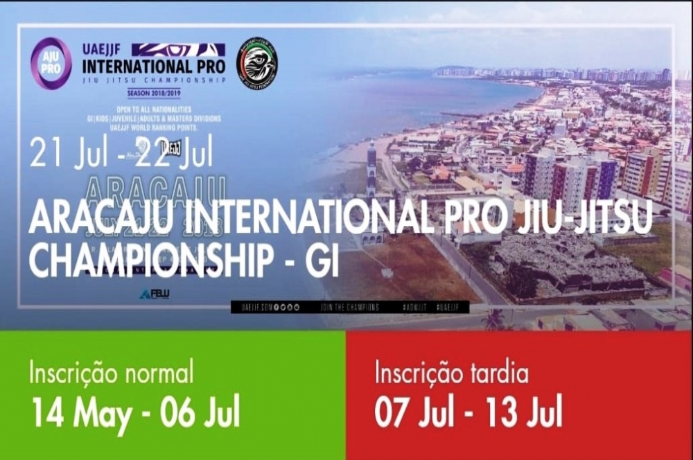 Ficarão abertas até o dia 6 de julho as inscrições antecipadas e promocionais para o Aracaju Pro Championship de Jiu-Jitsu, competição internacional de arte suave que será realizada nos dias 21 e 22 de julho no ginásio Constâncio Vieira. Organizada pela Federação Brasileira de Jiu-Jitsu e pela Confederação de Jiu-Jitsu dos Emirados Árabes Unidos, a competição reunirá 12 categorias: Kids 1, 2 e 3; Infantil, Junior, Adolescente, Juvenil, Adulto e Master 1, 2, 3 e 4.