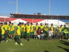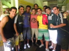 Quem aproveitou o ‘jogo do ano’ em grande estilo foram os três sorteados na promoção do Portal Infonet e seus respectivos acompanhantes. Eles puderam tirar fotos com os jogadores, autógrafos, pediram camisas e conversaram com os craques. Os sortudos ainda assistiram a partida do banco de reservas. “Valeu muito a pena. Agora quero ganhar o Pré-Caju”, disse Leonardo Passos, um dos ganhadores.     Ganhadores da promoção posam com Eli Carlos (de azul)
