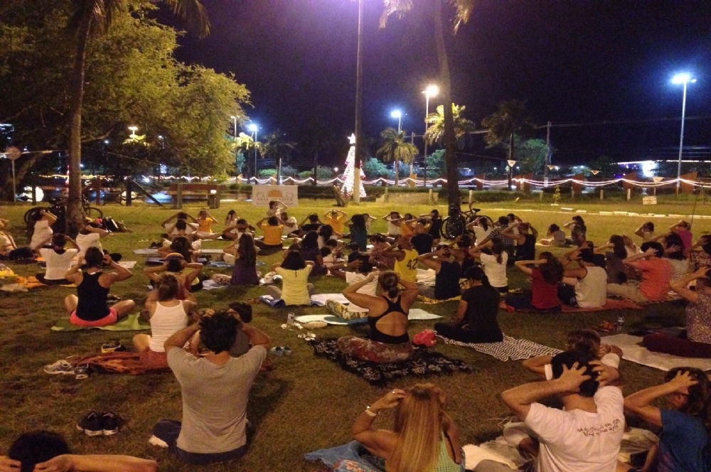| Pessoas se reúnem em meditação (Fotos: Divulgação/Arte de Viver) |