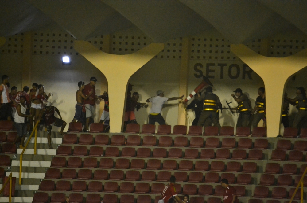 No episódio do último fim de semana, dezenas de torcedores que estavam no lado destinado à torcida do Sergipe iniciaram uma tentativa de ‘partir para cima’ da torcida adversária. Barrados pelos seguranças privados, o grupo entrou em conflito com a equipe de segurança e por pelo menos alguns minutos, protagonizou o lado triste da partida, sob olhos de uma multidão que foi ao estádio para ver futebol – e não uma batalha de socos e pontapés. A confusão somente terminou quando os policiais militares que faziam a segurança dentro do gramado se dirigiram às arquibancadas.