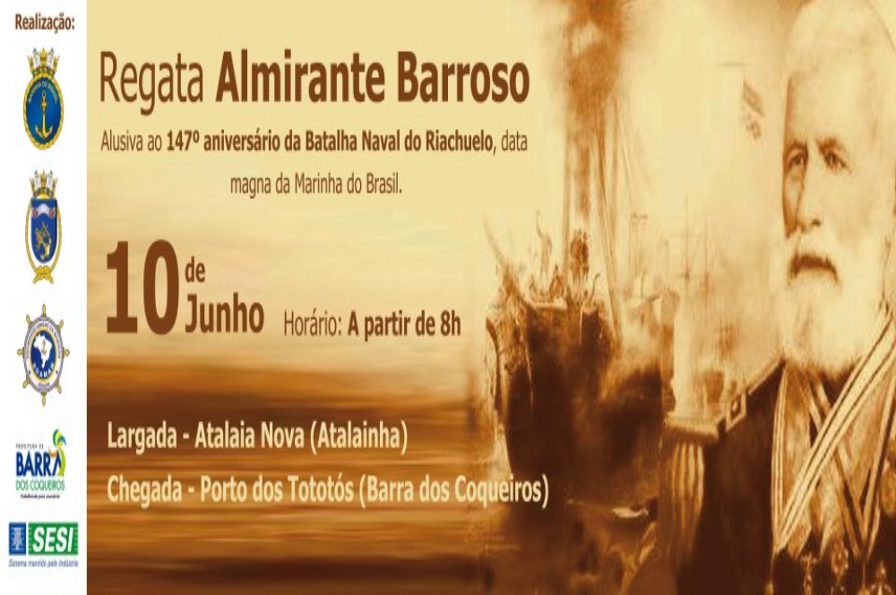 Nesta domingo, 10, vai acontecer a regata de barco a vela "Almirante Barroso" na Barra dos Coqueiros. A competição, que esse ano ganhou o nome de "Regata e Barco e Canoa a Vela Almirante Barroso" é alusiva aos 147º aniversário da Batalha de Riachuelo.