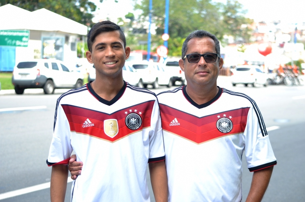O caso do contador Sérgio Cruz é ligeiramente diferente. Vestido ainda com a versão três estrelas da camisa alemã, Sérgio é admirador da seleção teutônica desde a Copa de 74. “Desde a época de Beckenbauer. Quando ganharam a copa de 90, comemorei. Perdemos de 7 a 1 porque a Alemanha jogou muita bola. Mas naquele momento fui Brasil até o fim”, conta. A admiração passou de pai pra filho: Sérgio Filho pegou gosto pelos alemães após o 7 a 1, adquiriu a camisa recente da tetracampeã, mas avisa que ainda é brasileiro. “Torci pro Brasil no 7 a 1 e chorei muito depois do jogo. Mas aqui não tem ressentimento”.
