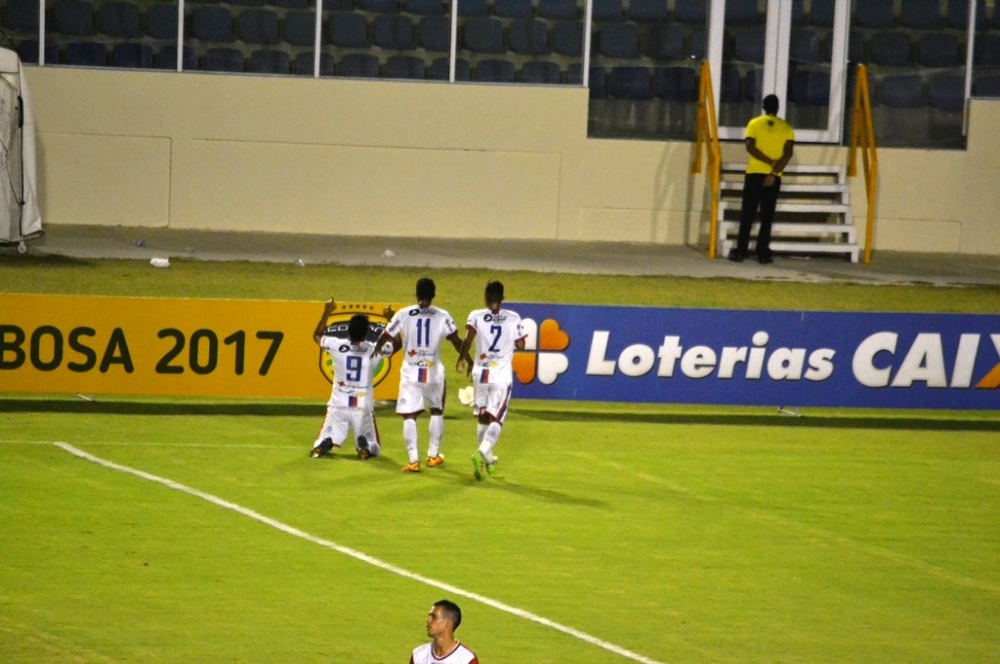 Depois que os times pararam de se estudar, o primeiro lance de perigo da partida levantou a torcida alvirrubra. Aos seis minutos, Genivaldo fez lambança, devolveu a bola meio mascada e a redonda parou nos pés de Elton. Ao ver o goleiro adiantado, o volante mandou do meio da rua e a bola bateu no travessão antes de sair.